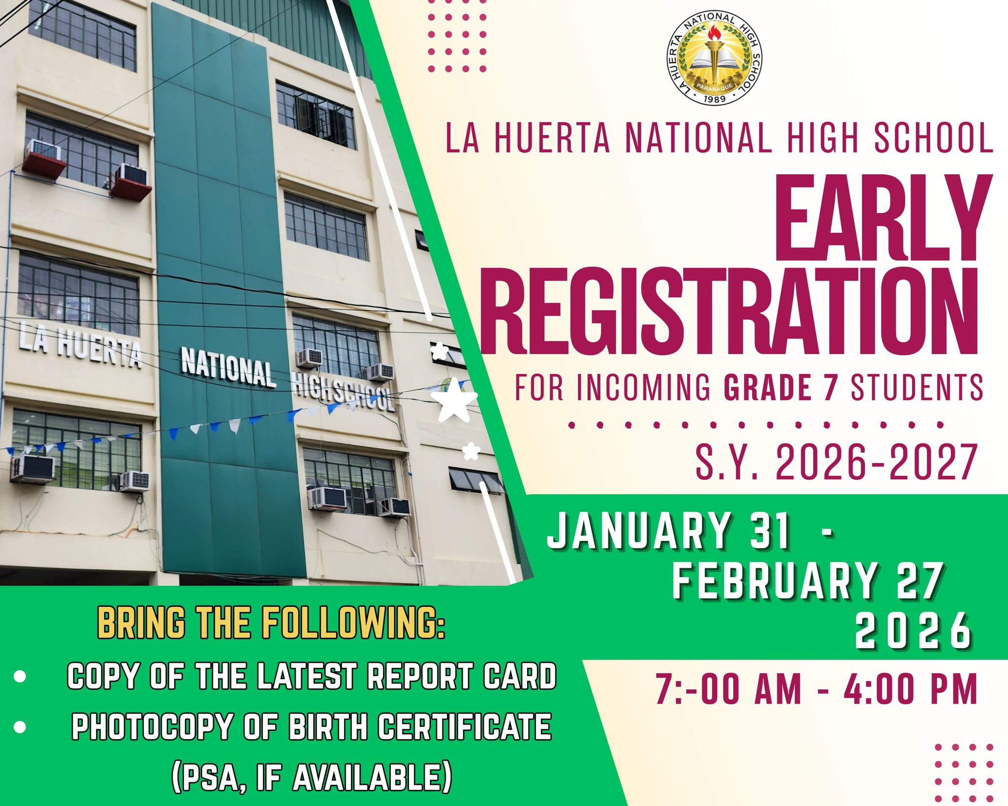 I welcome you to LA HUERTA NATIONAL HIGH SCHOOL website. This webpage aims to provide parents, students, the school community and other stakeholders with convenient access to vital information on school’s programs, projects, policies, updates on various services and activities. As your school head, it is an honor to work with our dedicated teachers and staff and Barangay La Huerta community to provide relevant educational experiences for our students. At La Huerta National High School, we are committed in providing a safe, caring, inspiring, and relevant learning environment for your children. I fervently hope that you will find useful information by visiting this website as we collaborate in order to produce competitive graduates who will soon be productive members of the society. In doing so, you can assure continued efforts from us where your comments and suggestions are most welcome. May our Almighty God continue to bless our school, our home - La Huerta National High School!